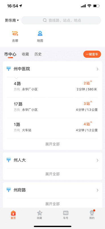 公交車到哪了,公交車還有多久到,打開 " 掌上公交 APP" →自動定位 " 黔東南 ",首頁即可查看附近公交站點、站點公交線路、公交車到站時間距離等信息。