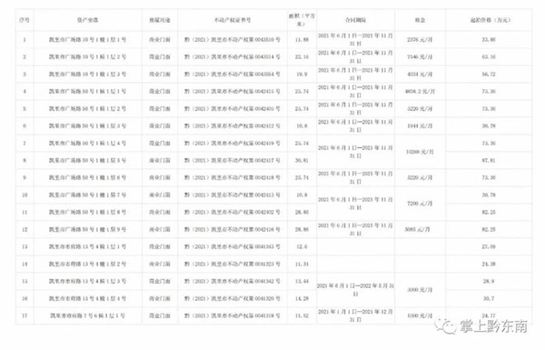 凱里市國有資產經營有限責任公司于2021年9月9日下午12時起至2021年9月10日下午12時止(競價周期與延時除外)在阿里巴巴資產處置平臺對凱里市城區內位于(寧波路、市醫路、永樂路、營盤西路)房產、門面(36處)產權進行公開競價,現公告如下: