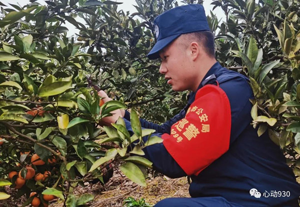來不及歇息,特警們當即拿上工具上山摘橘子。“這幾個橘子太小了,還不能摘吧。”“你看那一片數量才多,去摘那邊。”大家一邊說著,一邊將摘下的橘子放進袋子。期間,帶隊負責人不時提醒特警們動作輕點,別傷了橘樹的枝丫。