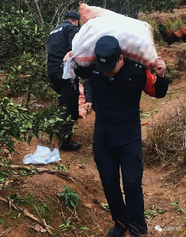 抬著水果下山時,特巡警們成了山里一條靚麗的風景線,在完成裝車后,特警們還自掏腰包,買下200多斤橘子。