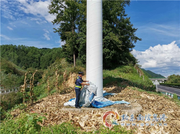 本網訊 9月6日下午,雷山路政執法大隊路政員開展日常巡查至S63凱從高速下長坡互通匝道時,發現樹立在高速公路旁的立柱廣告牌幕布在空中飄搖,嚴重影響高速公路路容路貌。見狀路政員立即將車輛停靠在安全位置下車進一步查看情況。
