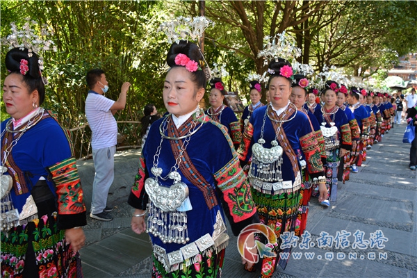 2021年“國慶節(jié)”期間,天氣晴好,民眾出游熱情高漲。被稱為“天下西江”的雷山縣西江千戶苗寨,憑借魅力四射的民族吊腳樓群、精彩紛呈的民族歌舞表演、獨(dú)特的民族風(fēng)俗和迷人的自然風(fēng)光。其間,西江旅游公司備足馬力,推出“非遺”大巡游展示、“滿月酒”巡游展示,在北大門、營上服務(wù)區(qū),讓游客體驗(yàn)“高山流水”酒禮,在西江蘆笙坪用兩臺大木鼓,敲擊響亮的聲音,100余名苗家女身著盛裝隨著鼓聲的節(jié)奏,翩翩起舞,喜迎國慶,盛世華誕,苗族青年“游方”情歌對唱,苗族老人“古歌”對唱,苗族刺繡技藝展示,苗族銀飾制作技藝展示等34項(xiàng)民俗活動(dòng),讓游客分散到景區(qū)各“苗文化”項(xiàng)目展示點(diǎn),多角度、全方位地體驗(yàn)和了解當(dāng)?shù)孛缱屣L(fēng)情文化或參與各種苗族風(fēng)情互動(dòng)活動(dòng),讓旅客游得開心,玩得盡興。每天有數(shù)千游客租用苗族服飾穿著在西江苗寨中山青水秀的“白水河”(二、三號風(fēng)雨橋下)兩旁和觀景臺、蘆笙坪等留影紀(jì)念。一位來自新疆維吾爾自治區(qū)朱女士接受筆者采訪時(shí)說:“西江千戶苗寨有美麗的自然風(fēng)光,奇特的民居建筑,真是山清水秀啊,以后我會多帶朋友到雷山來旅游,體驗(yàn)這里的原生態(tài)民族文化。”