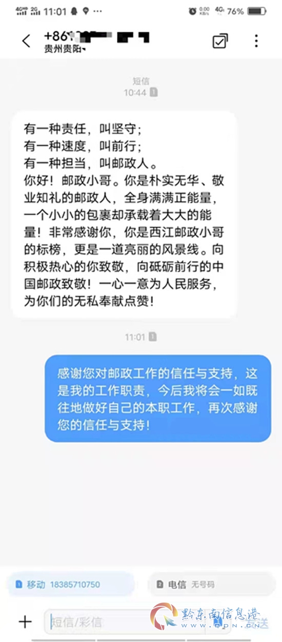 包裹寄遞出去后三天,郵政小哥打電話回訪李女士,鵝蛋是否有破損,李女士回復(fù)道:“你們包裝的太周到了,一個(gè)都沒(méi)有破損,謝謝你們的關(guān)心,我還正準(zhǔn)備給你們打電話說(shuō)這事了,真的是太感謝你們郵政了。”掛完電話后,李女士就給郵政小哥發(fā)來(lái)贊揚(yáng)的短信。