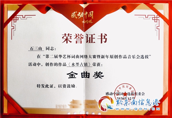 近日,黔東南原創音樂人石三山與貴州詞作者楊長文、及黔東南州民族歌舞團演員龍昌慧合作的一首將苗寨特色與江南風情相結合的歌曲《水墨古鎮》在感動中國第二屆華藝杯詞曲網絡大賽中喜獲金曲獎。