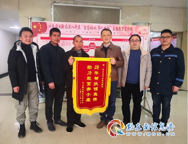 本網訊 為感謝黔東南州交通運輸局歷年來對榕江縣平永鎮龍塘村的真情幫扶。春節前夕,龍塘村村支兩委成員代表向州交通運輸局送去“歷年幫扶傾真情 助力脫貧奔小康”錦旗。