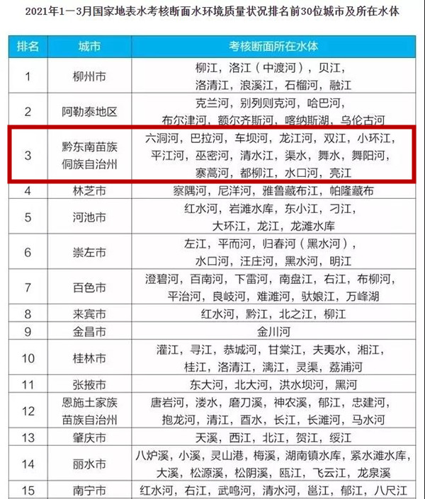 2021年,全州國家地表水考核斷面共20個,考核斷面所在水體涵蓋六洞河、巴拉河、車壩河、龍江河、雙江、小環江、平江河、巫密河、清水江、渠水、舞水、舞陽河、寨蒿河、都柳江、水口河、亮江。2021年1-3月,全州20個國家地表水考核斷面水質優良(Ⅰ~Ⅲ類)斷面比例達100%。