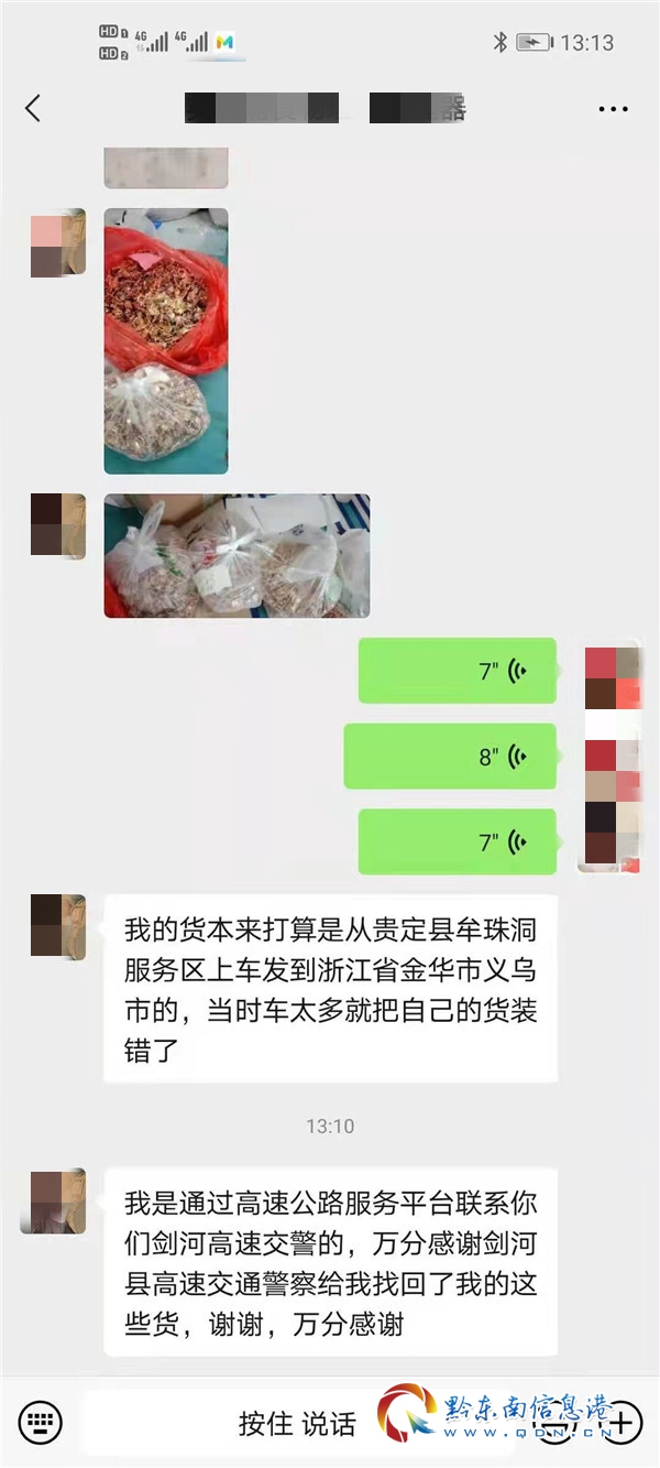 當(dāng)日18時(shí)16分左右,黔東南州公安局交警支隊(duì)高速四大隊(duì)值班室群眾報(bào)警稱:我把貴重的物品放錯(cuò)車了,請出警攔截物品所在的車輛。