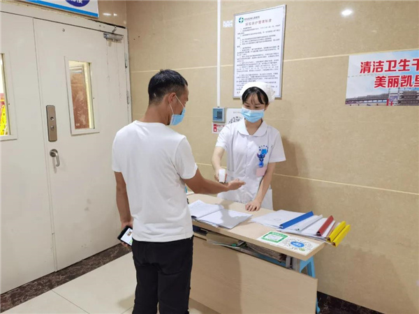 “您好,請出示一下健康碼、行程碼”,“您好,請這邊測量體溫……”,預檢分診作為醫院防控的第一道防線,肩負重任,黔東南州人民醫院加派醫護人員和精干力量嚴防死守每一道關口,實行24小時值班制,查驗“健康碼”、“行程碼”,測量體溫、指導患者保持一米間距、對發熱及健康碼異常的人員,由預檢護士從專用通道引領到發熱門診就診排查,嚴格控制不能進入診療區域。在氣溫37度的高溫下,預檢分診人員默默地堅守崗位,汗流浹背,衣服濕漉漉地穿一整天,大家一絲不茍,堅決守好疫情防控“第一關”。