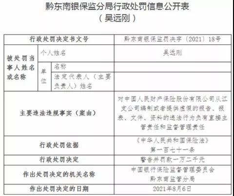 中國人民財產保險股份有限公司從江支公司因編制或者提供虛假的報告、報表、文件、資料,被罰11萬。
