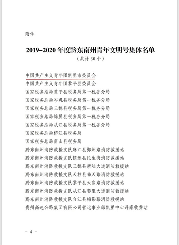 根據《關于做好2019-2020年度黔東南州級青年文明號評選考核工作的通知》(黔東南青通[2021]11號)要求,經嚴格審核、逐級推報、擇優遴選、現場考察、社會公示,共青團黔東南州委決定,在2019-2020年度黔東南州青年文明號創建周期中,對符合創建條件且表現突出的中國共產主義青年團凱里市委員會等30個青年創建集體,命名為“2019-2020年度黔東南州青年文明號”。