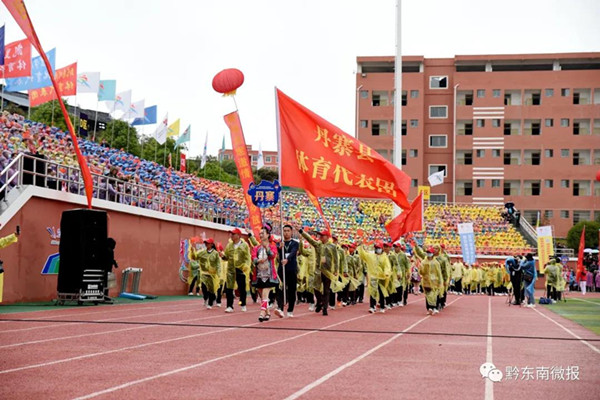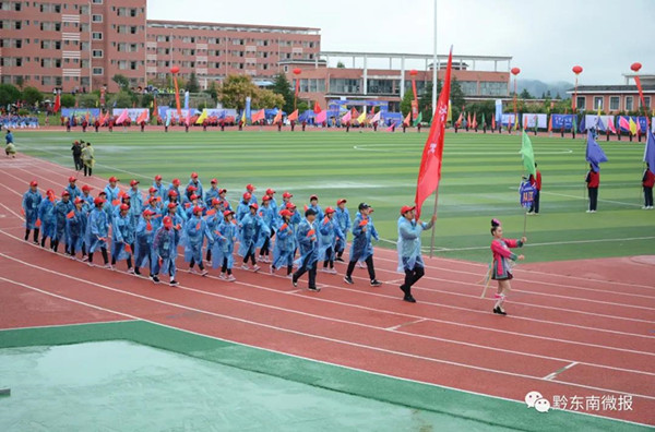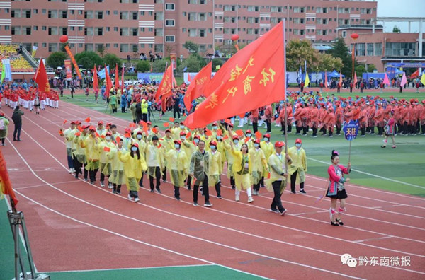 10時15分,譚夔宣布:黔東南州第十屆運動會暨第四屆少數民族傳統體育運動會開幕。頓時,全場沸騰起來,掌聲、歡呼聲經久不息。伴隨著本屆運動會會歌《共有一個夢想》響起,兩面會旗同時升到國旗兩旁。運動員代表、裁判員代表宣誓的聲音回蕩在會場,昭示著此次運動會正式拉開帷幕。