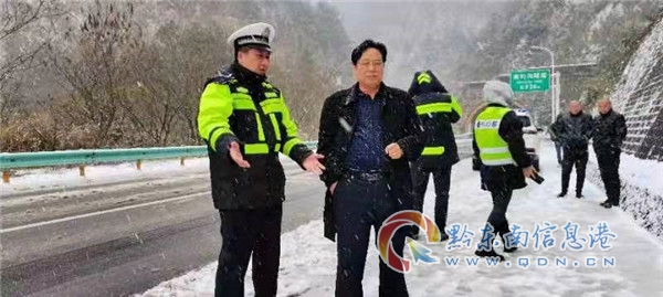 省公安廳交管局車管處宋文峰處長(右一)一行到黔東南督促指導低溫雨雪凝凍惡劣天氣抗凝保暢工作