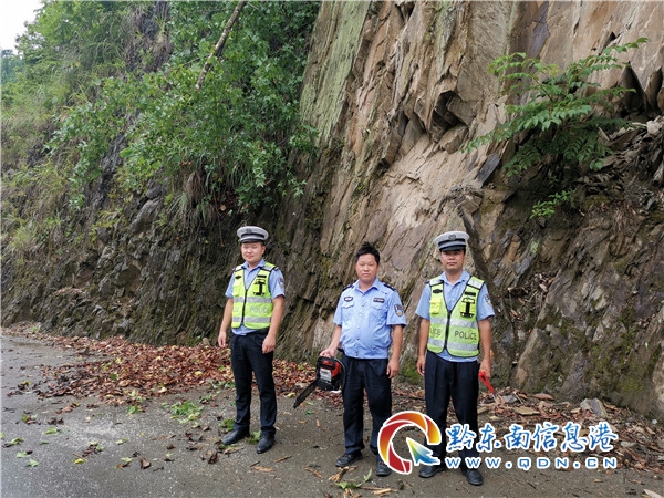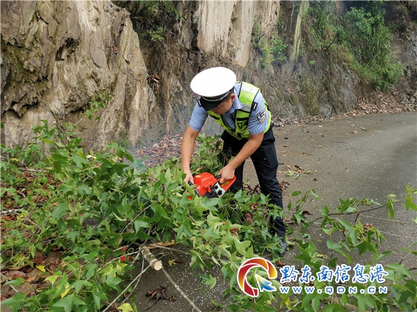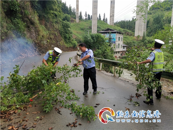 當天,因轄區突降暴雨,榕江縣公安局交警大隊農村片區交警五中隊在八開鎮轄區開展巡邏時,發現八開往計劃方向路段有樹枝倒在道路上,影響了往車輛的正常通行,過往車輛在發現障礙物時,為避讓障礙物而變道或緊急剎車,極易發生交通事故,嚴重影響路面交通安全和過往駕駛員生命財產安全,存在安全隱患。