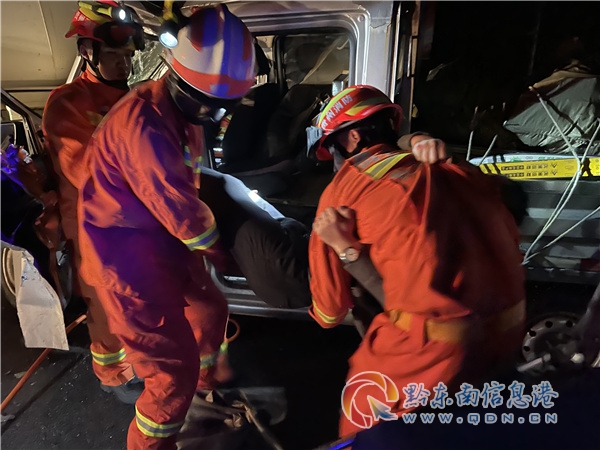 本網訊 10月13日19時04分,貴州省臺江縣消防大隊接到群眾報警稱,臺江縣臺拱街道鐵橋路段一輛工程車與面包車相撞,面包車駕駛員被困。臺江消防救援大隊立即出動一個搶險救援編隊立即趕往事故現場。