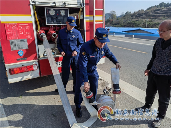 消防指戰員到達目的地后,由于前往種植地的道路彎曲狹窄,車輛行駛比較困難,此時的樹農早已在狹窄的路口等待送水的指戰員,經樹農做“向導”,很快到達樹苗種植地。來不及片刻休息,指戰員們便快速熟練的開展送水工作,鋪設水帶、安裝接口、開閘、出水、加壓,只見一股清澈的“甘露”從水帶里噴射而出流入蓄水池中。蓄水池注滿后,指戰員又利用車載炮出水噴灑樹苗,防止樹苗因時間過長難以成活。