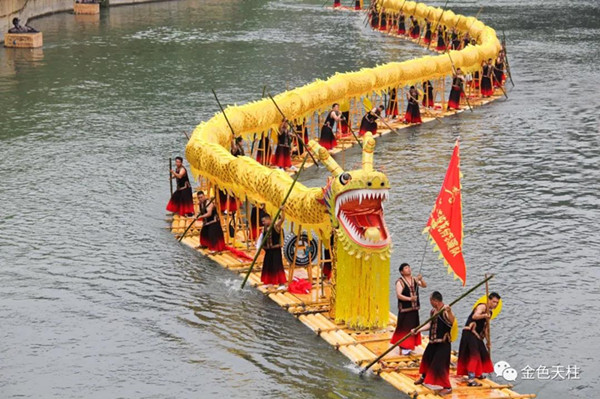 表演中,一條由20余只木排連接而成的金色“長龍”緩緩駛過舞臺前方。鼓點聲、吶喊聲與舞臺上的開場節目《山歌水舞》遙相呼應,共同“點燃”現場。全體演員以飽滿的精神狀態,認真細致的動作表情,將富有北侗民族特色的《略板略》《鮮花滿坡歌滿河》《對歌對到日落坡》《北部侗族民歌》和極具震撼的《唱支山歌給黨聽》等精彩歌舞表演,逐一呈現給現場觀眾。觀眾們也紛紛拿出拍攝設備記錄下這美好、精彩時刻。