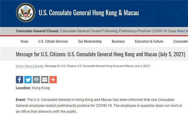 據(jù)美國駐港總領(lǐng)事館官網(wǎng)發(fā)布的消息,領(lǐng)事館有一名職員初步確診新冠,該領(lǐng)事館由明天(6 日)起關(guān)閉,等候該名職員的正式確診結(jié)果,同時(shí)會進(jìn)行徹底清潔和消毒。因此,6 日公民及簽證服務(wù)會取消。