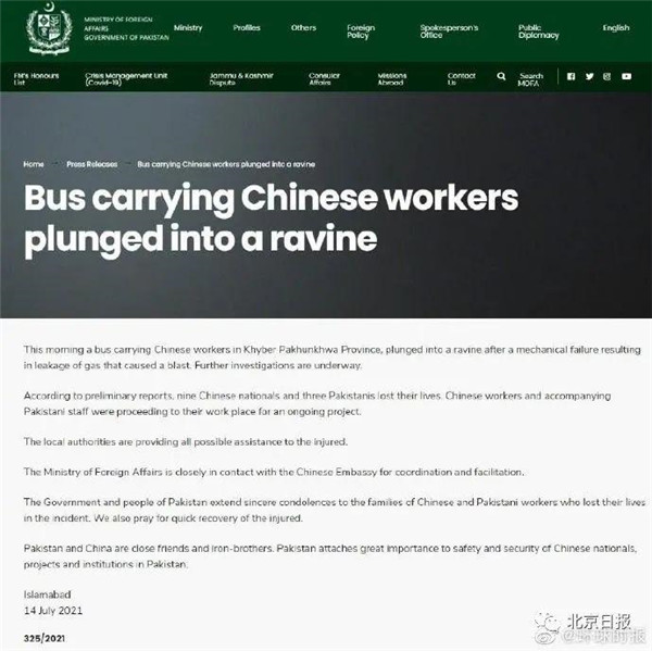 聲明稱,據(jù)初步報道,9 名中國公民和 3 名巴基斯坦公民喪生。聲明還稱,地方政府正在為傷者提供一切可能的援助。