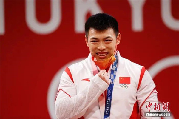 北京時間 7 月 25 日晚,在東京奧運會男子舉重 67 公斤級比賽中,中國選手諶利軍以抓舉 145 公斤、挺舉 187 公斤、總成績 332 公斤奪冠,打破挺舉和總成績奧運紀錄的同時,也為中國體育代表團摘得本屆奧運會的第六金。圖為諶利軍在頒獎儀式上摘下口罩。中新社記者 韓海丹 攝