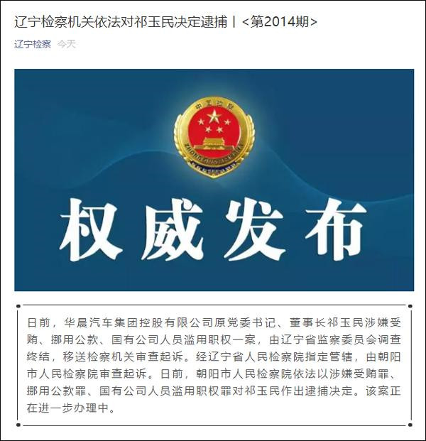 微信公眾號 " 遼寧檢察 "6 月 19 日消息,日前,華晨汽車集團控股有限公司原黨委書記、董事長祁玉民涉嫌受賄、挪用公款、國有公司人員濫用職權一案,由遼寧省監察委員會調查終結,移送檢察機關審查起訴。經遼寧省人民檢察院指定管轄,由朝陽市人民檢察院審查起訴。日前,朝陽市人民檢察院依法以涉嫌受賄罪、挪用公款罪、國有公司人員濫用職權罪對祁玉民作出逮捕決定。該案正在進一步辦理中。