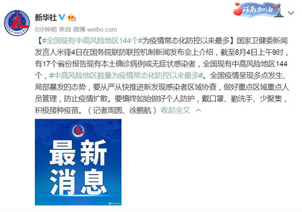 國家衛健委新聞發言人米鋒 8 月 4 日在國務院聯防聯控機制新聞發布會上介紹,截至 8 月 4 日上午 9 時,有 17 個省份報告現有本土確診病例或無癥狀感染者,全國現有中高風險地區 144 個,中高風險地區數量為疫情常態化防控以來最多。全國疫情呈現多點發生、局部暴發的態勢,要從嚴從快推進新發現感染者區域協查,做好重點區域重點人員管理,防止疫情擴散。要慎終如始做好個人防護,戴口罩、勤洗手、少聚集,積極接種疫苗。