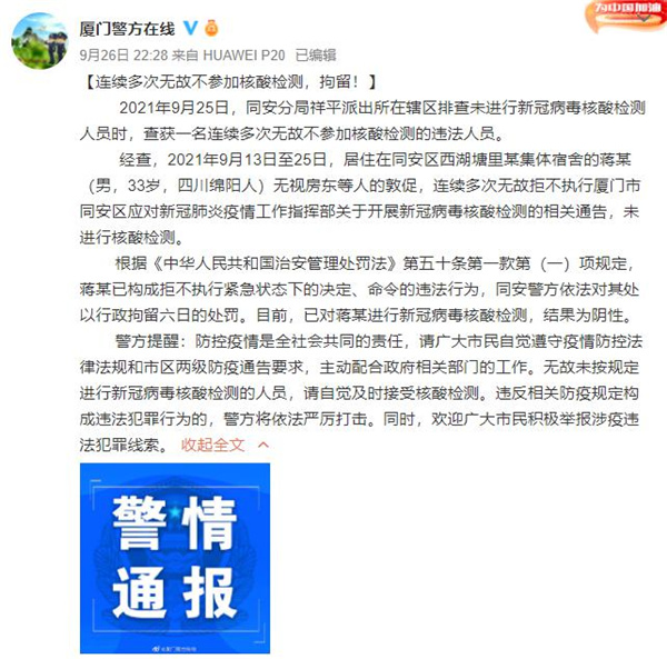 2021 年 9 月 25 日,福建省廈門市公安局同安分局祥平派出所在轄區排查未進行新冠病毒核酸檢測人員時,查獲一名連續多次無故不參加核酸檢測的違法人員。