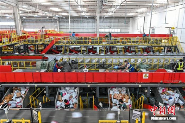 資料圖:工作人員將快遞包裹放入分撥傳送帶上。 中新社記者 陳驥旻 攝