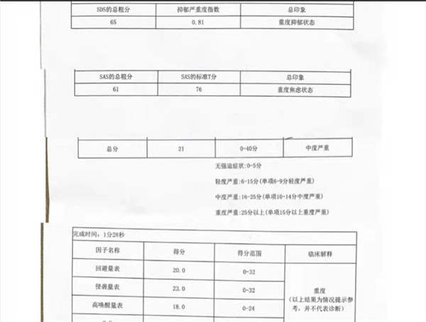 據(jù)王先生提供的魏女士事后進(jìn)行心理測試的結(jié)果顯示,魏女士的抑郁嚴(yán)重度指數(shù)是0.81,臨床解釋為“重度抑郁”。