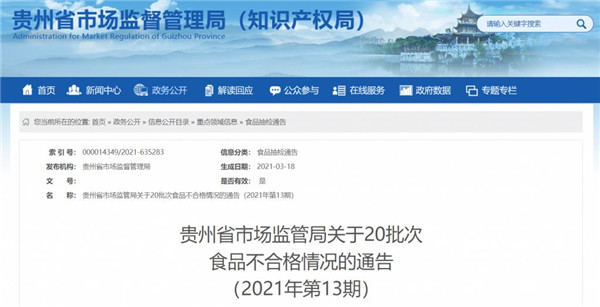 近日,貴州省市場(chǎng)監(jiān)督管理局網(wǎng)站發(fā)布關(guān)于 20 批次食品不合格情況的通告。