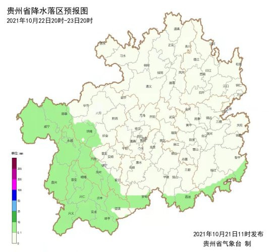 貴州省氣象臺10月21日15時發布未來三天天氣預報,預計21日到22日,受云貴靜止鋒影響,我省維持低溫陰雨天氣,全省大部地區最高氣溫普遍不足15℃,較常年同期偏低6℃左右;22日白天氣溫將達到最低,冷的程度堪比常年冬至節氣前后的氣溫。23日白天,全省大部雨水消散,氣溫開始明顯回升,省會貴陽日最高氣溫將達14℃。