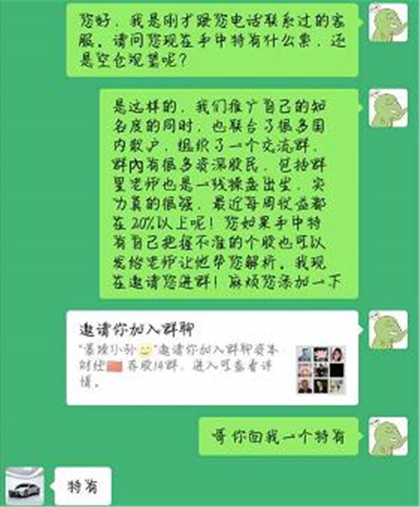 只有經中國證監會許可,取得證券投資咨詢業務資格的證券公司和證券投資咨詢機構,才可以從事證券投資咨詢業務。合法機構可以在中國證監會、中國證券業協會網站進行查詢核實。如發現有非法機構或個人通過微信從事薦股活動,請不要參與,以免造成財產損失。如已參與被騙,請收集好證據材料,及時向當地公安機關報案。