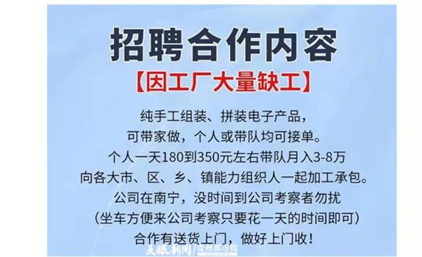 廣告稱,因工廠缺工人,因此,可提供兼職,兼職者只需在家做簡單手工活,無需機器,既可個人做,也可帶隊做。