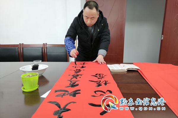 正在書寫的龍君香老師說:“過年貼春聯是中華民族一直延續的老傳統,有著廣泛的群眾基礎和社會宣傳效應,此次我們鎮開展的送春聯活動,起到了很好的傳遞社會正能量作用,我們都很樂意并盡力寫好,為全鎮的老百姓送上我們的祝福。”
