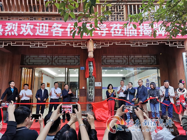 袁尚凱、李東文、胡朝庭、廖流波、劉國興以及企業代表共同為貴州口岸黔苗旅行社有限公司揭牌。