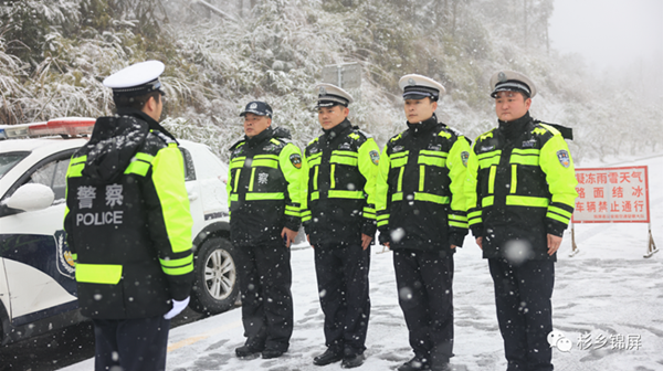 記者來到G242錦屏往天柱方向的高登坡路口看到,雖然大雪紛飛,錦屏縣公安局交通警察大隊民警們依舊在路口設崗值守,設置警示標志,并對過往車輛和行人進行勸返。