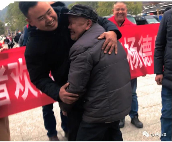 將近一個小時的車程后,寶貝回家志愿者和楊再義、楊有八及養父來到了家里。一進門,楊有八就跪倒在門邊,用這樣的方式彌補這些年的“遲到”。幾位兄妹和村里老人們見狀,立馬上前將他扶起,這么多年,他們也想念這個活潑可愛的娃娃,如今他終于回來了。