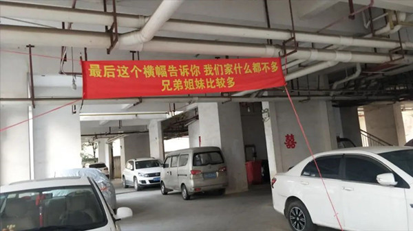 這么新穎、前衛的結婚儀式,還是博來了不少人的眼球,進入小區的業主都停留下來,看橫幅上的標語,紛紛給主人翁點贊。