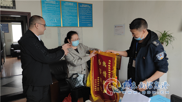 裴站長接到該乘客求助后,急乘客所急,想乘客所想,立即在值班站長崗位電腦當失主的面調取失主當天購票過程的監控視頻沒發現有手機遺失售票窗口(臺),接著調取失主行包過“三品”安檢機至上車這段視頻也沒手機線索后,帶失主母子二人來車站二樓車站監控室調取4月8日車站全天全方位監控視頻回放進行觀看,發現了手機遺落安檢機傳輸帶下面的地上后,隨即帶失主母子二人到售票大廳查看時,手機已不在安檢機傳輸帶下面時,裴站接找來售票大廳所有相關崗位人員詢問,當得知沒有人員拾到該手機,這時恰遇失主有事急需回家處理,也正好到了上午下班時間,因此,失主母子二人有些失落又于心不甘也不抱太大希望地與裴站長互留聯系方式,拜托裴站長繼續幫忙查找一下手機情況就離開了車站。失主離開車站后,裴站長在想:既然手機已確定是遺落“三品”安檢機下面而車站工作人員在下午下班清掃大廳衛生也沒人拾到,那就可能是手機遺落之后至下午下班前這幾個小時的視頻回放來查看,看是否是哪位乘客拾到了。因此,裴站先利用這天中午休息的兩個小時的時間來回放“三品”安檢崗位方位視頻無果,下午上班后又一邊上班一邊繼續回放監控視頻,功夫不負有心人,經下午仔細多次回看監控視頻到五點左右時終于發現:有一女性乘客在將自已行包放入“三品”安檢機入口進行安檢時,彎腰在安檢機傳輸帶下面拾一東西放入自已衣服口袋,再進一步慢放仔細辯認時這位乘客拾到的是一部手機,裴站長將此視頻截圖發在自己手機上后,立即拿該截圖到車站發車位請駕駛員辨認,有無認識這位乘客的,這時一灣水車駕駛員說:“認識,她是灣水街上附近的居民”時,裴站就拜托該駕駛員:麻煩他幫忙去作這位乘客的思想工作,希望她發揚拾金不昧的精神,把拾到的手機帶回車站,我代表公司、代表車站及失主感謝她。當收到灣水客車駕駛員帶回失主手機的第一時間,裴站就聯系了失主兒子潘某叫其來車站領回手機,于是就有了本文開頭的一幕即失主莫桂芝及其兒子前來車站領回手機并贈送錦旗,以感謝市運司苗都車站工作人員工作敬業,熱情為乘客解憂,使乘客貴重物品失而復得。