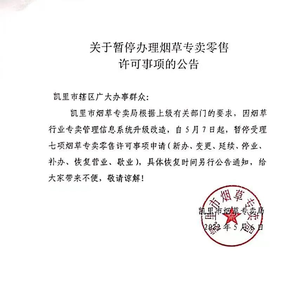 凱里市煙草專賣局根據(jù)上級(jí)有關(guān)部門的要求,因煙草行業(yè)專賣管理信息系統(tǒng)升級(jí)改造,自5月7日起,暫停受理七項(xiàng)煙草專賣零售許可事項(xiàng)申請(qǐng)(新辦、變更、延續(xù)、停業(yè)、補(bǔ)辦、恢復(fù)營(yíng)業(yè)、歇業(yè)),具體恢復(fù)時(shí)間另行公告通知,給大家?guī)?lái)不便,敬請(qǐng)諒解!