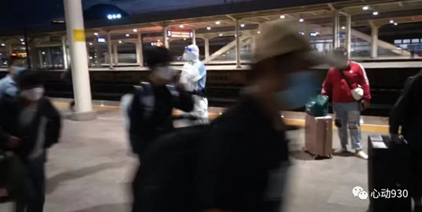 晚上20:03分,隨著高鐵站廣播的播報,168名返鄉人員們拿著行李陸續下車,有序排著隊站在站臺上,多名身穿防護服的工作人員間隔站立,引導著大家出站。