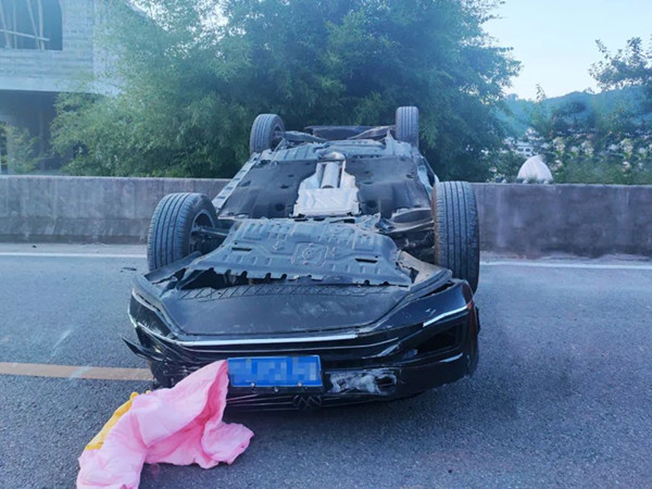 接警后,凱里市公安局交警大隊大風洞中隊民警立即驅車趕赴現場處置,到達現場后,發現一輛轎車“四腳朝天”橫躺在道路上,車輛受損嚴重,駕駛人站在車旁,驚魂未定。
