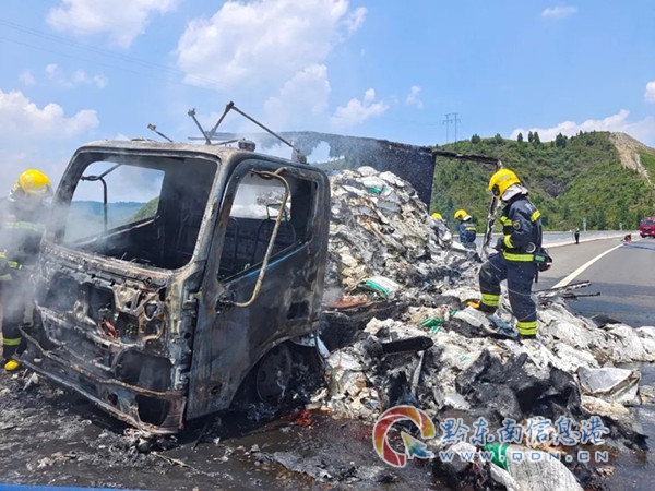 據了解,事故車輛為一輛拉葡萄糖粉末的廂式貨車,因電路短路造成車輛自燃,現場無人員傷亡。目前車輛停滯于行車道與應急車道中間。