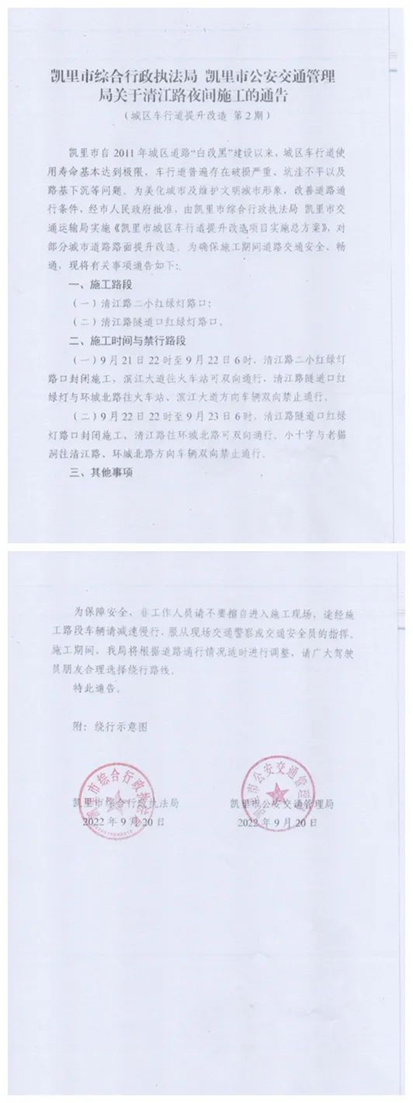 凱里市綜合行政執法局凱里市交通運輸局實施《凱里市城區車行道提升改造項目實施總方案》,對部分城市道路路面提升改造。為確保施工期間道路交通安全、暢通,現將有關事項通告如下:
