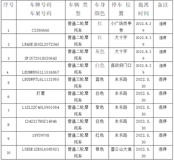 為深入推進道路交通“打非治違”專項工作開展,嚴厲打擊道路交通領域非法違法行為,切實維護轄區交通安全形勢持續穩定向好,努力營造安全有序的通行環境,根據《中華人民共和國道路交通安全法》、《中華人民共和國道路交通安全法實施條例》相關規定,對不按規定停放在道路兩旁及人行道上的車輛依法拖離現場,被拖離的車輛,請車輛所有人或管理人于15日內攜帶車輛相關證件到雷山縣公安局交通警察大隊接受處理,對逾期未處理的,公安機關將依法對車輛進行處理。
