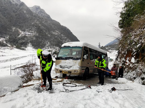 2月23日,氣溫回升,民警再次聯(lián)系事故當(dāng)事人準(zhǔn)備對其車輛實施救援。雖然國省道上的積雪開始消融,但牛鴉山村道上仍然有大量積雪,參與救援的民輔警經(jīng)過約30分鐘的徒步,帶著工具艱難地走了三公里“雪路”后終于趕到現(xiàn)場,對事故車輛開始實施救援。經(jīng)過3小時的全力施救,終于將車輛拉回車道,但由于該路段積雪較厚依然不具備通行條件,就指令駕駛?cè)藢④囃?吭诎踩范危e雪進(jìn)一步融化后再出發(fā)。當(dāng)事人表示十分感謝麻江公安交警的積極救援,他們將繼續(xù)在村民家休息等待天氣進(jìn)一步好轉(zhuǎn),再視路面情況謹(jǐn)慎出行。