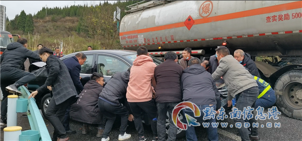 事故發(fā)生后司機(jī)迅速在車后150米處擺放三角警示標(biāo)提醒來車注意避讓,不久后方空載的油罐貨車在緊急避讓中由于車身長、車軸寬而無法通過,導(dǎo)致路面堵塞。此時,后方來車輛越來越多,交通堵塞多一秒則多一分危險,執(zhí)法人員現(xiàn)場查看該車損壞情況后,發(fā)現(xiàn)小車車頭部位尚有著力點(diǎn),在不造成二次損壞的情況下可以進(jìn)行徒手救援,在與該車駕駛員溝通后,決定對該車進(jìn)行徒手挪車救援。