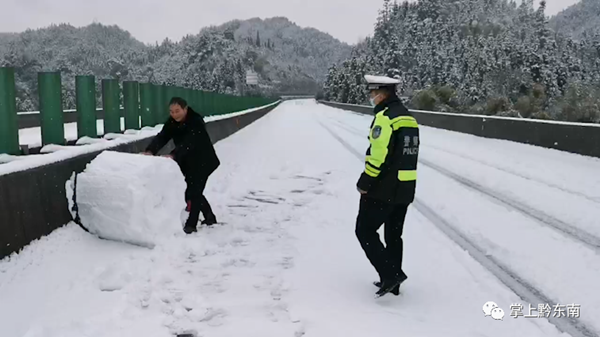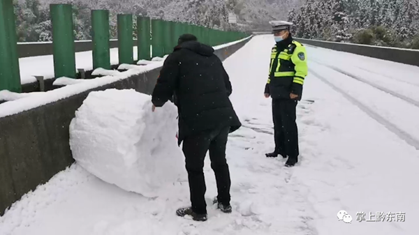 為了確保安全,中午11點—12點鐘,民警在松從高速268km—272km處,發現路面有很多打雪仗、堆雪人的行為,當場進行了制止和引導人群下高速公路,并清除了路面的11處雪人堆。