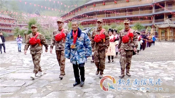 93歲的志愿軍老戰(zhàn)士為新兵牽上牛王,并走在歡送隊伍前列,為新兵鼓勁送行,向新兵祝以不畏艱險,勇往直前的美好祝愿。期望新兵入伍后一定要努力發(fā)揮自身優(yōu)勢,牢記強軍目標(biāo),獻身強軍實踐,刻苦訓(xùn)練,努力學(xué)習(xí),為國為家爭光添彩。“牛王出征”儀式歡送新兵,充分體現(xiàn)榕江侗家人民崇軍擁軍的傳統(tǒng)。