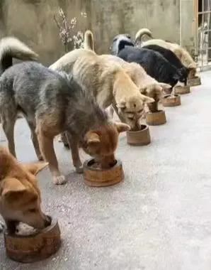 隨著主人的一聲口令,大狗從樓梯上跳下來去到各自飯盆前吃飯,有兩只調皮的尾巴方向錯了但隨著主人再次口令狗子立馬糾正。