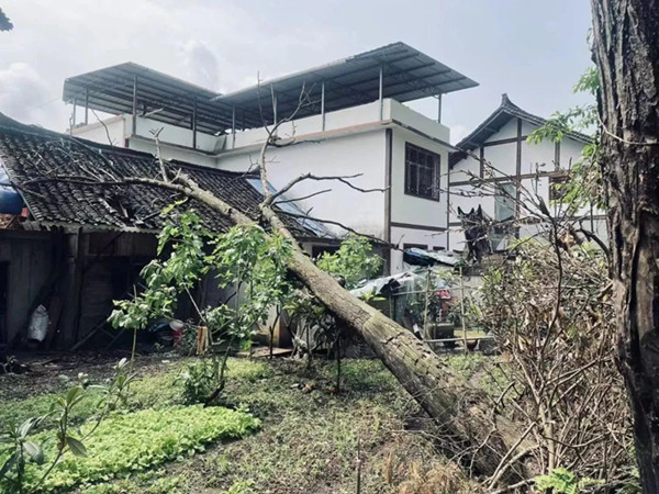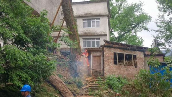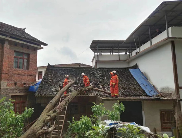 4月25日,凱里經濟開發區消防救援站接到報警村民報警稱:因24日晚強降雨導致樹木倒塌,砸到房屋房頂,麻煩快來處理一下!